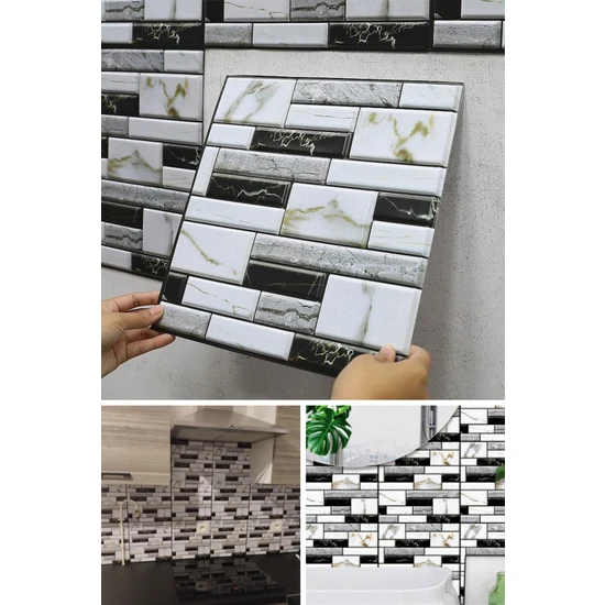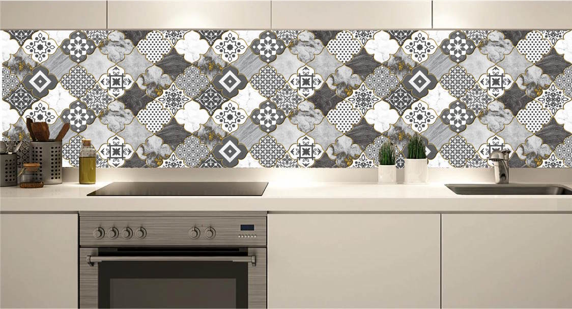 KENDİNDEN YAPIKANLI - ÖZEL TASARIM ÇİNİ MERMER GEOMETRİK DESEN 3D MUTFAK ARASI SERAMİK ÜSTÜ FOLYO KAPLAMA