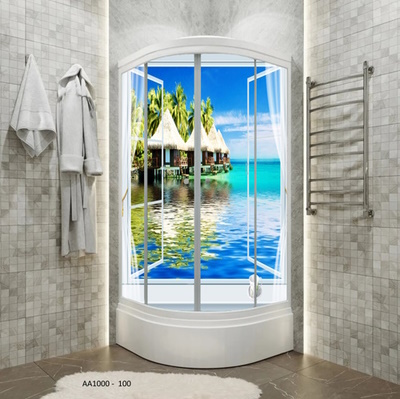 3Boyutlu Kendinden Yapışkanlı Açılan Pencereden Deniz Manzarası Deniz Üstünde Ev Ağaçlı Model 4 Camlı Duşakabin Kaplama Folyosu