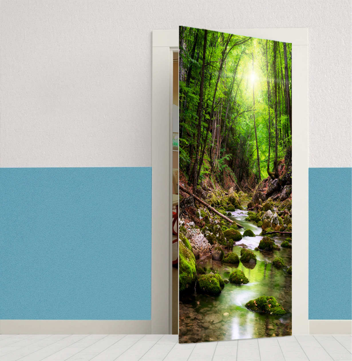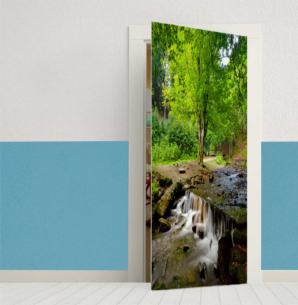 3Boyutlu Orman Ağaçların Arasında Uzanan Ahşap Köprü Model Kendinden Yapışkanlı Kapı Folyo Kaplama