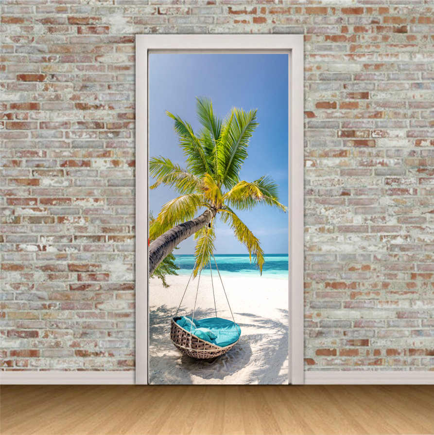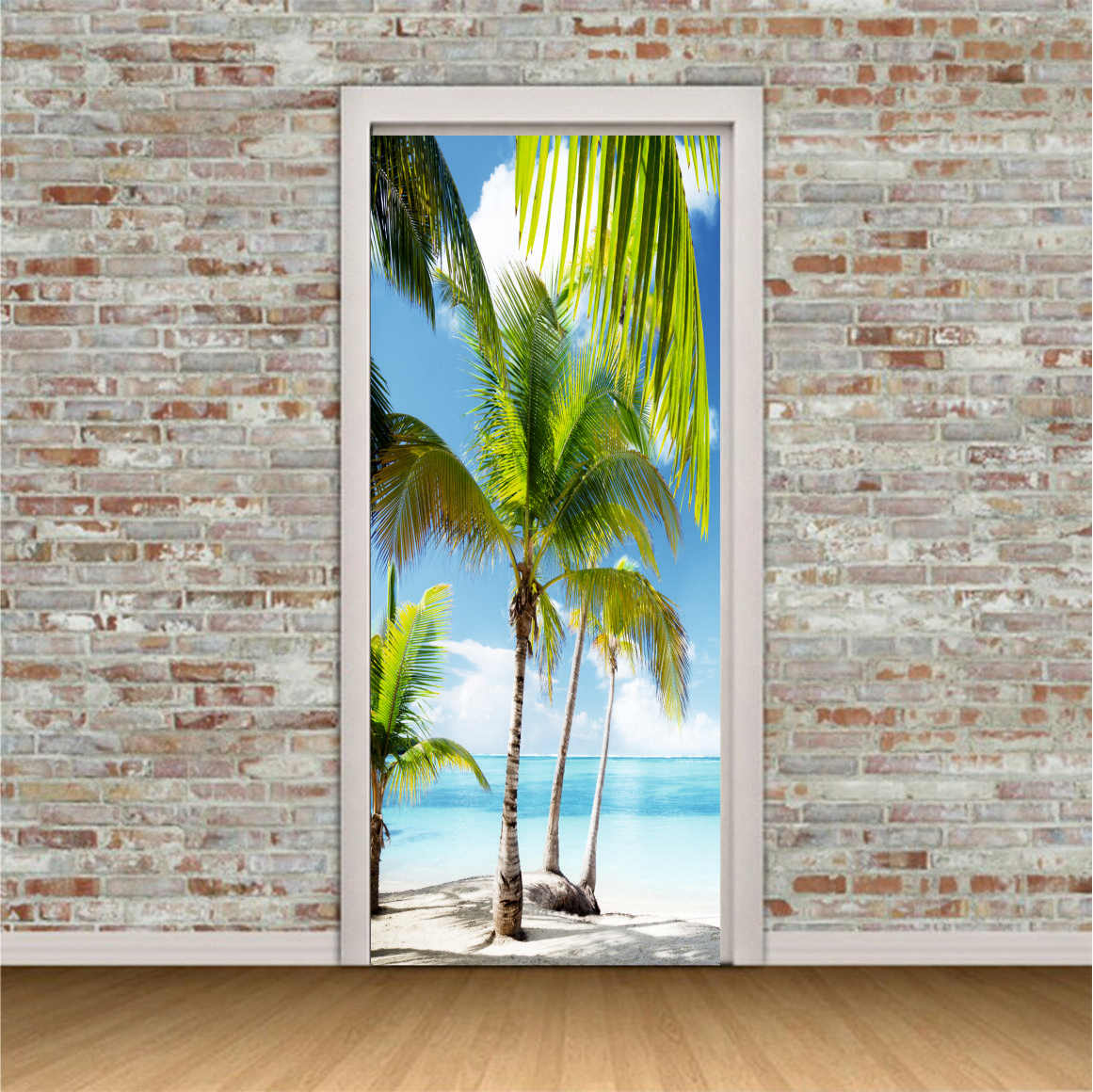3Boyutlu Palmiye Ağacı Kumsal Deniz Manzaralı Model Kendinden Yapışkanlı Kapı Folyo Kaplama