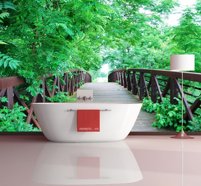 3D Kendinden Yapışkanlı Yeşil Yapraklı Ağaçlar Kahverengi Ahşap Köprü Yürüyüş Yolu Derinlik Model Banyo Duvarı Folyo Kaplama