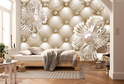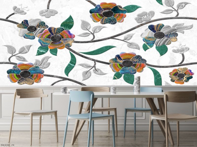 3D Yırtılmaz Tek Parça Duvar Kağıdı Cappicino Renklerinde Çiçekli Taş İnci Detaylı Geometrik Model