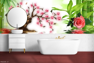 3D Kendinden Yapışkanlı Pembe Güllü Ağaç Su Yansımalı Bambulu Model Banyo Duvarı Folyo Kaplama