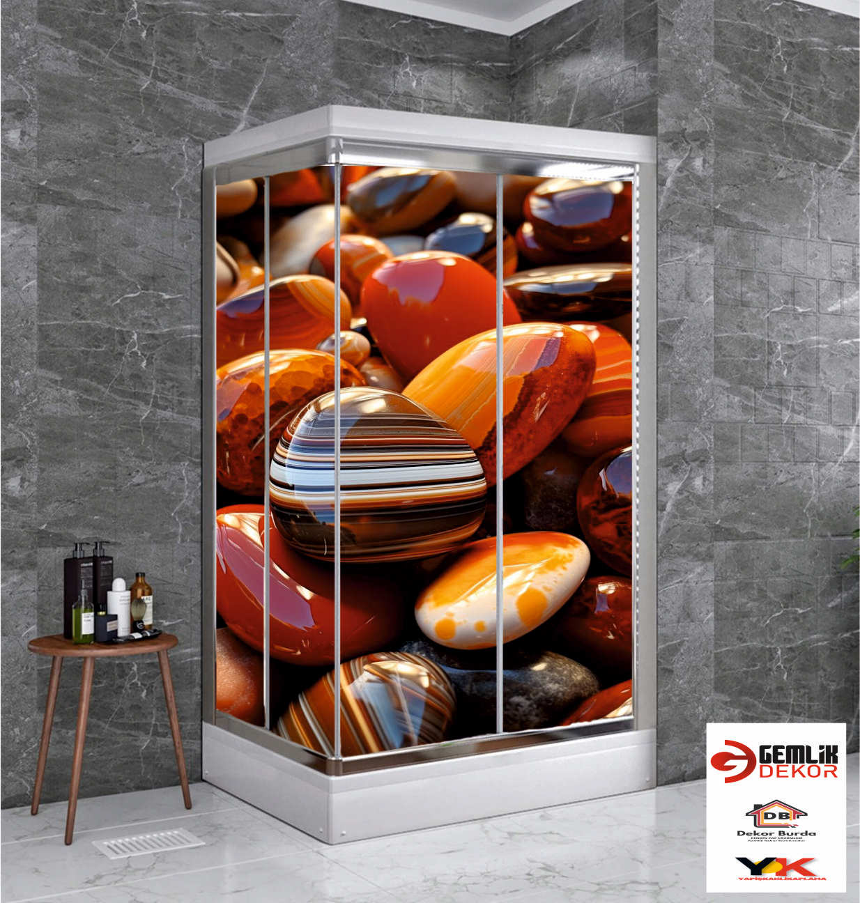 YUVARLAK KAHVE RENGİ TAŞ DESENLİ DUŞAKABİN KAPLAMA
